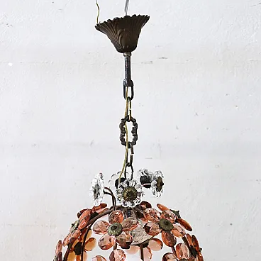 We present this exclusive Italian pendant lamp, dating back to the early 20th century. The lamp has an iron structure with a characteristic sphere design, completely covered with large flowers with amber glass petals (probably from Murano). It has a single light bulb inside.