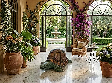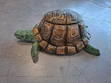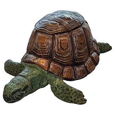 Magnificent decorative turtle sculpture, made of high-quality metal, ideal for enriching your garden, terrace, or interior with a touch of elegance and originality. This turtle catches the eye thanks to its remarkable size and realistic details, with a two-tone finish that enhances its texture: Shell: With a finish that recalls aged bronze or brass, rich in three-dimensional veins and reliefs. Body: Green color with oxidized patina effect, giving a rustic and lived-in look, perfect for the outside. Main Features: Material: Strong and durable metal (also ideal for the outside). Imposing Dimensions: Length: 83 cm Height: 40 cm Depth: 60 cm Weight: 20 kg - Ensures stability and robustness. Perfect for: Garden Furniture: A striking focal point between the flowerbeds or by the pool. Interior/Veranda: A unique design element for spacious living rooms or entryways. Collectors: A sculptural piece of great visual impact. It is not a simple garden statue, but a work that combines art and solidity. A real talk!