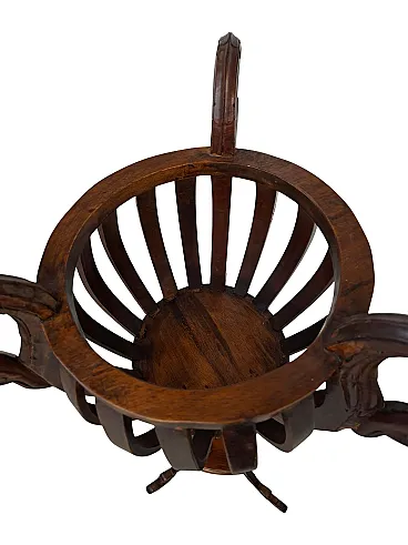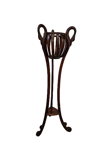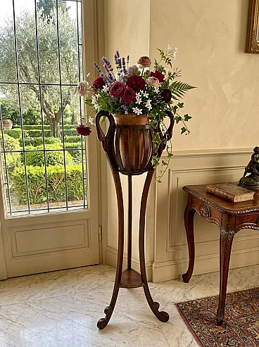 splendid original vase holder from the 90s, made of fine cherry wood with a warm and welcoming color. The design features sinuous lines and arched legs that end in curly feet, supporting a carved slatted basket perfect for housing your favorite plants. It is a furnishing complement that combines aesthetics and practicality: with its height of 130 cm, it allows you to lift plants from the ground, also enhancing those with a drooping habit. The structure has a footprint of 40 cm in width and 40 cm in depth, dimensions that make it ideal for giving character to a corner of the living room, an entrance or a hallway without being too bulky. Despite the solidity of the wood and its scenic presence, the vase holder is surprisingly easy to handle and move for cleaning, thanks to a weight of only 2 kg. The item is in excellent vintage condition, solid and ready to use.
