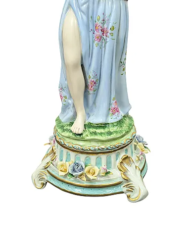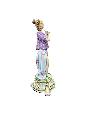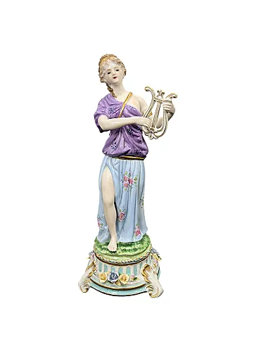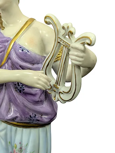 This refined polychrome porcelain statuette depicts a female figure in classical clothing, probably a muse, caught in the act of playing a lyre. The girl wears a draped peplum in shades of lilac and pastel blue, embellished with delicate hand-painted floral motifs that recall the applications in relief on the base.