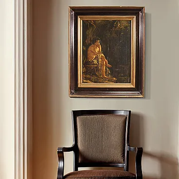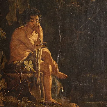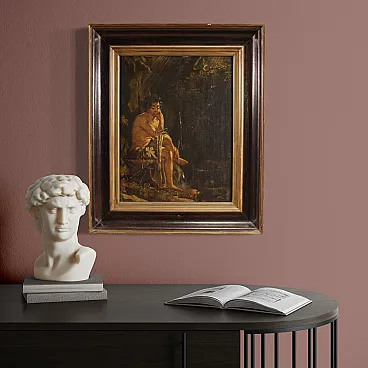 Antique French painting from the late 18th century. Oil on panel work depicting a religious subject, Saint John the Baptist in meditation of discreet pictorial quality. Small-sized painting adorned with a modern wooden frame carved and adorned with partial gilding (bronze colour).