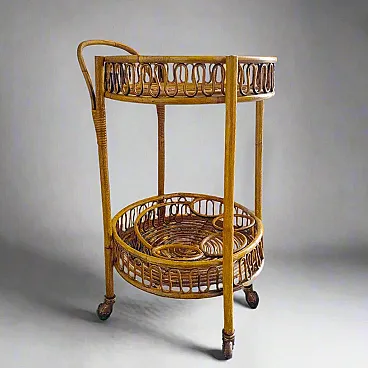 1960s Gorgeous Bamboo & Rattan Serving Bar Cart Trolley by Franco Albini. Made in Italy. This exquisite serving cart is a quintessential example of Italian Mid-Century Modern design, attributed to the renowned architect Franco Albini. Handcrafted in Italy during the 1960s, the piece features a sophisticated bent bamboo and rattan structure that seamlessly blends organic materials with architectural precision.