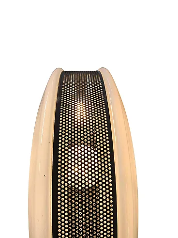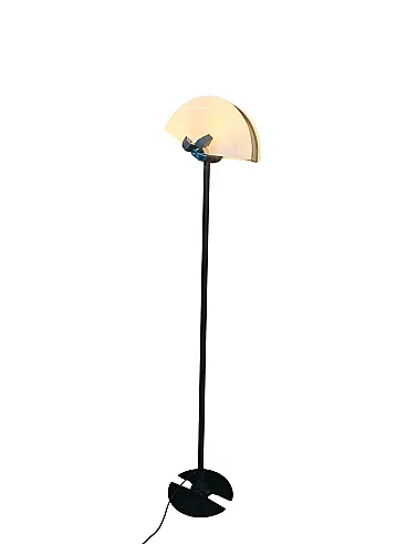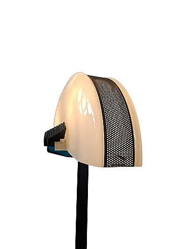 Stunning designer plantain lamp dating back to the 1970s/1980s, a piece that combines the solidity of industrial style with the refinement of Venetian artisanal glass. It features a solid iron load-bearing structure, featuring the iconic "U" base, designed to blend seamlessly with desk, table, or sofa legs, optimizing space. The focal point is the rectangular indirect light shade (uplighter), which houses: A diffuser in fine white Murano glass (ideal for soft and uniform light scattering). Elegant blue blown glass details, giving a unique and handcrafted touch of color. TECHNICAL DETAILS: Electrical system: Dual ignition with 2 E27 connections (perfect for modern high-power LED bulbs). Materials: Iron and Original Murano Glass. Height: 176 cm. Dimensions Lampshade: Width 40 cm Depth 22 cm. Base: Width 31 cm (space-saving fork design). Weight: about 10 kg (guarantees extreme stability). STATE OF STORAGE: The lamp is in excellent vintage condition, only the base has some bubbles in the paint, the rest of the iron structure is intact and the glass has no spinning or peeling. Ideal for professional studios, industrial-style lofts or living rooms looking for a piece of character.