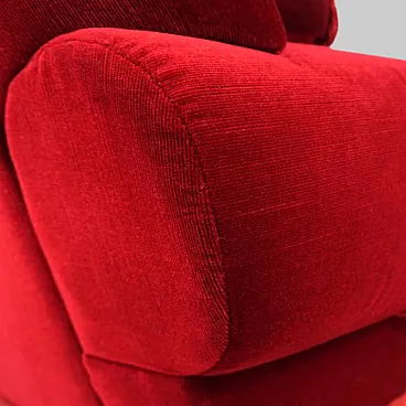 The fabric upholstery is in very good condition overall. It has only a small, inconspicuous hole under the seat cushion and a barely visible tear on the backrest. The armchair stands on chrome casters which are concealed by the cord trim.