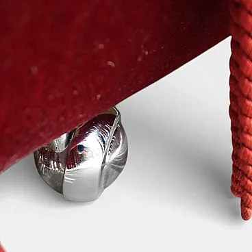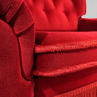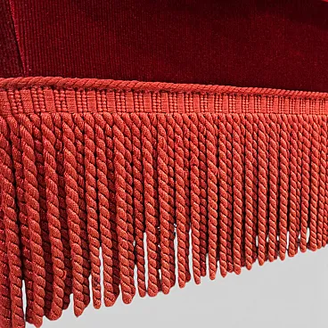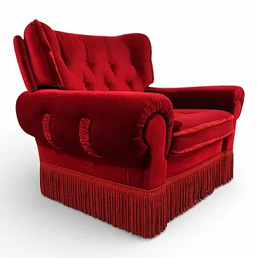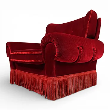 This opulent vintage armchair embodies the glamorous charm of bygone decades, blending the elegant style of the Hollywood Regency with the luxurious aesthetics of Art Deco . Upholstered in a deep red, velvety fabric, the armchair exudes warmth, elegance, and a distinctive presence.