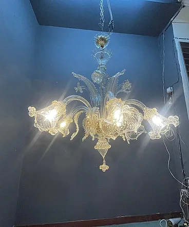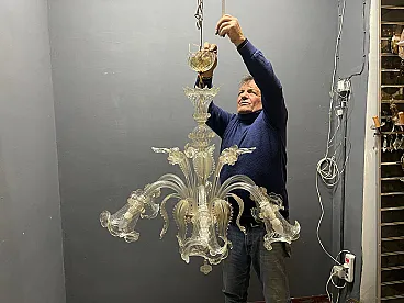 Exceptional pair of large Venetian chandeliers handcrafted in Murano, Italy, featuring elegant mouth-blown clear glass enriched with delicate golden hues. The sculptural composition highlights the finely crafted glass arms, floral details and ornamental elements characteristic of traditional Venetian glass making. Each chandelier is composed entirely of hand-molded glass components, creating a light and airy appearance while maintaining a commanding presence. The delicately colored golden accents enhance the diffusion of light, creating a warm and sophisticated atmosphere, ideal for dining rooms, living rooms, entrances or hospitality interiors. The chandeliers feature six lights each and have been recently rewired, ready for installation. Each chandelier weighs approximately 15 kg. Details • Origin: Murano, Italy • Materials: Mouth-blown Murano glass • Color: Transparent with golden hue • Light source: 6 E14 chandelier bulbs • Weight: Approx. 15 kg each Dimensions (each) • Height: 95 cm • Width / Diameter: 85 cm Condition Excellent condition with minor signs of wear consistent with hand-crafted glass objects. Newly installed wiring