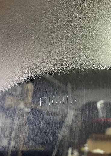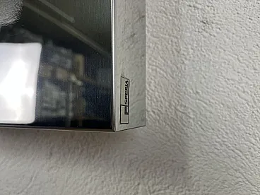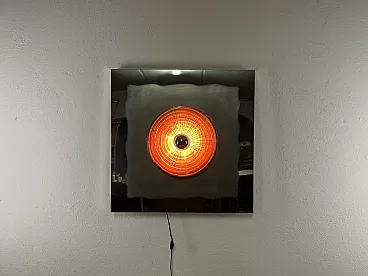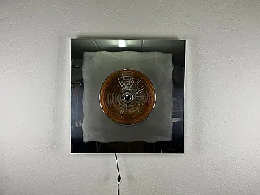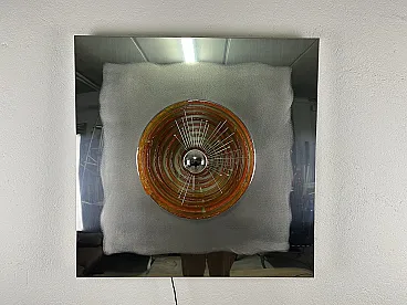 Brushed steel and Murano glass light panel designed by Angelo Brotto and produced by Esperia in the 70s’. The panel has been thoroughly cleaned, no defects have been reported, and the manufacturer's signature and label are present. Measures 80 x 80 x 18 cm