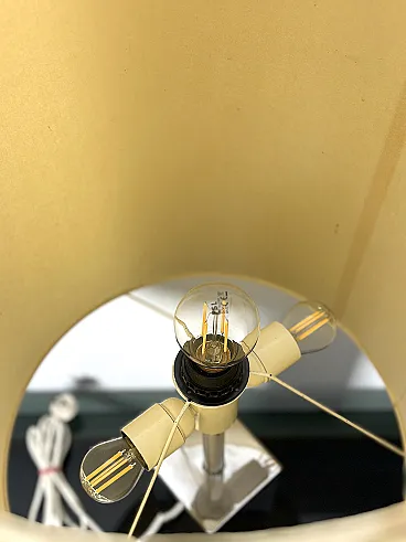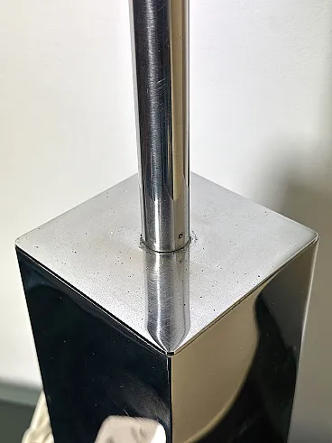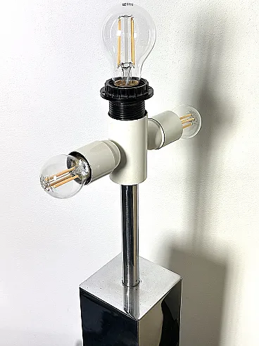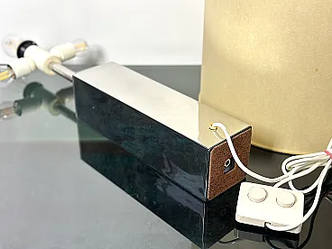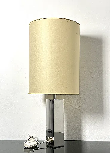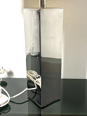 Refined vintage table lamp, an authentic example of Italian modern design from the 1970s. This model is characterized by a solid square-section column base in shiny chromed metal, a distinctive element of Goffredo Reggiani's productions. The reflective structure creates a dynamic mirror play, typical of the Space Age and Hollywood Regency aesthetics. The large original cylindrical fabric lampshade diffuses a soft and welcoming light, making it ideal as a reading lamp or as a furnishing element for desks and side tables in elegant and contemporary interiors. PERFECT CONDITIONS Measurements: Height 95 cm. Width 40 cm - Depth 40 cm - Base 10 x 10 x 30