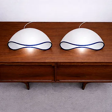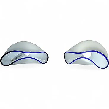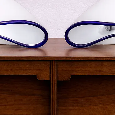 The design stands out for its fluid and sinuous shape, characterized by an organic silhouette reminiscent of a soft wave or a folded ribbon. The body of the lamp is made of milky white Murano glass, while the edge is finished with an elegant intense blue profile that follows the wavy line of the shape, creating a refined chromatic contrast.