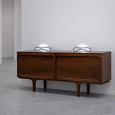 When the lamp is turned on, the white glass diffuses a soft and uniform light, while the blue edge elegantly defines the profile of the object.