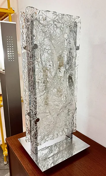 An object that goes beyond function and is placed in the territory of luminous sculpture. It features a chrome-plated metal architectural structure that divides two important hot-worked art glass plates.