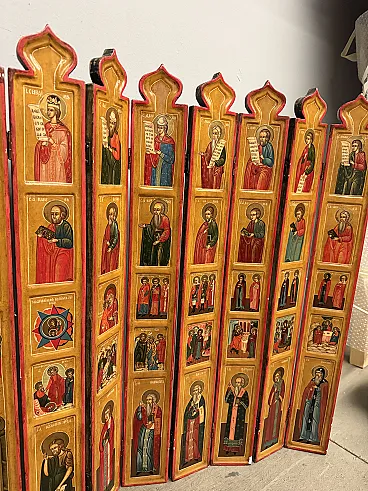 Painted Russian travel icon with painted saints, 20th century