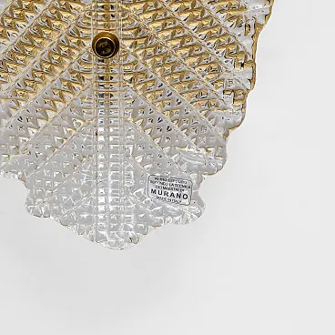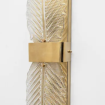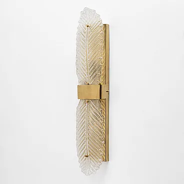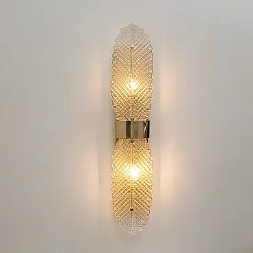 Refined wall lamps composed of two Murano glass elements made with grit, shaped into a stylized leaf. The clear glass features a richly textured surface with geometric patterns and tiny reliefs, which diffuse light softly and shimmeringly, creating a highly decorative effect on the wall.