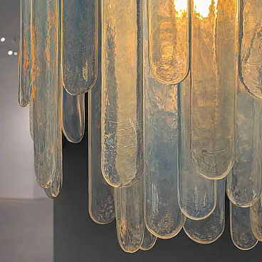 The particular opalescent finish gives the glass an extraordinary luminous quality, with reflections that range from milky white, pale blue and light mother-of-pearl shades. Even when turned off the chandelier maintains a very strong sculptural presence; when switched on, it instead diffuses a warm, soft and suggestive light, capable of enhancing the volume and depth of the composition.