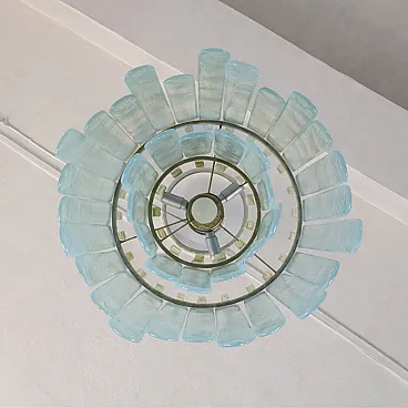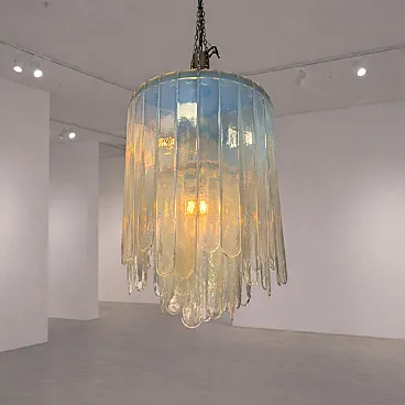 Refined Cascade model chandelier in opalescent Murano glass, designed by Carlo Nason for Mazzega in 1970. The structure is composed of a succession of elongated blown glass elements, arranged in an overlapping manner to create an elegant and dynamic cascading cylindrical silhouette.