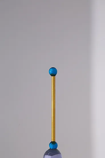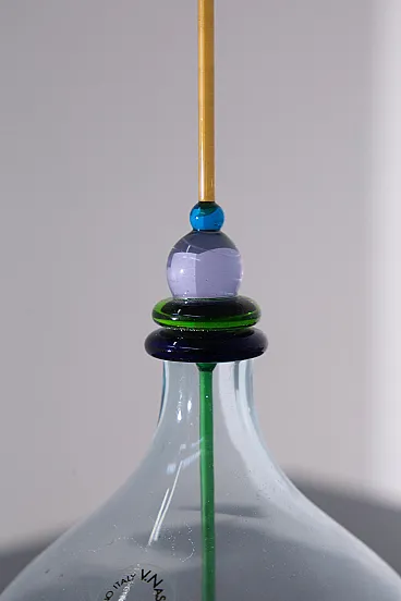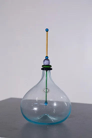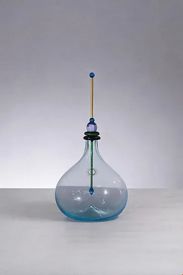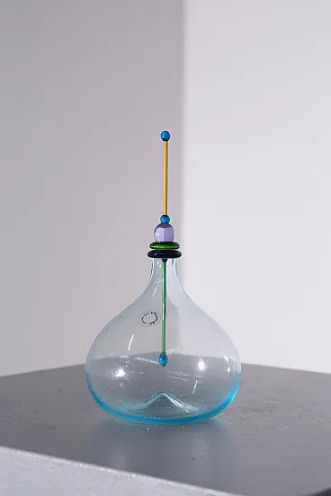 Carlo Nason for Murano Glassworks Artistic Bottle / Small Decanter, 1980s Murano Glass, original label A highly refined artistic bottle, or small decanter, designed by Carlo Nason for a Murano glassworks in the 1980s, and preserved with its original label. An elegant example of Italian postmodern glass design, the piece embodies the playful sophistication and sculptural freedom that define Murano production of the period. Executed in light blue Murano glass, the bottle is distinguished by its soft, generous body and its extraordinary hand-modeled stopper, composed of stacked geometric elements in differently colored glass. This vertical composition introduces a vibrant architectural rhythm, transforming the object into a refined interplay of balance, color, and form. The dialogue between the rounded silhouette of the vessel and the linear, almost totemic presence of the stopper gives the piece a distinctly artistic character. Both decorative and functional in spirit, it transcends the idea of a simple bottle or decanter to become a true sculptural object. Of particular note, the bottle retains both its original label and Nason’s acid-etched signature at the base, elements that further enhance its authenticity and collectible appeal. Remarkable for its elegance and craftsmanship, this piece is ideally suited for display in a living room, cabinet, or curated interior setting, where it can be appreciated as a work of postmodern Italian artistic glass of great visual charm and technical mastery.