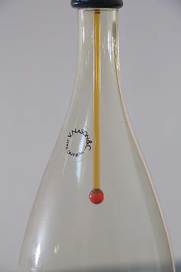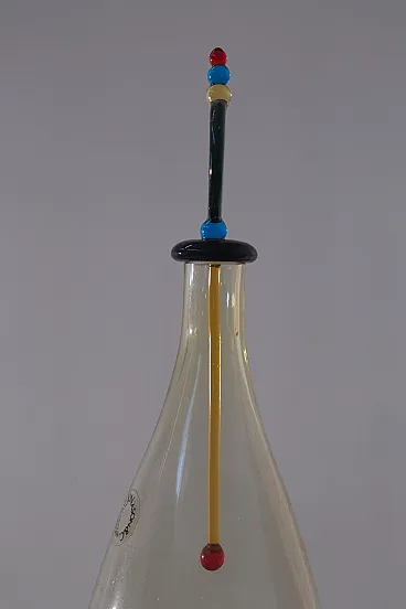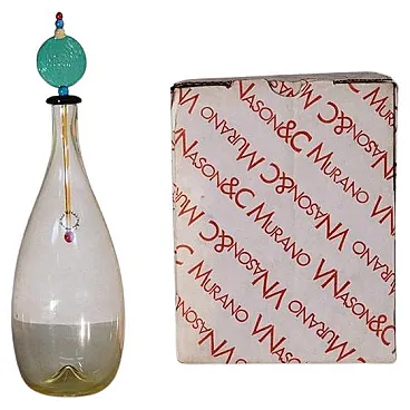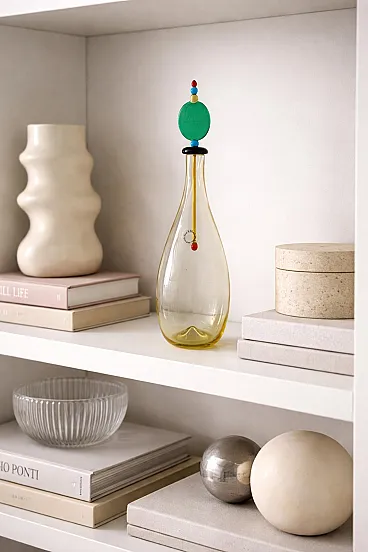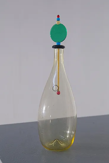 Carlo Nason for Murano Glassworks Artistic Bottle / Small Decanter, 1980s Murano glass with original label and original box A refined artistic bottle, or small decanter, designed by Carlo Nason for a Murano glassworks in the 1980s, preserved with its original label and accompanied by its original box, a particularly desirable detail for collectors and connoisseurs. Executed in yellow Murano glass, the bottle is distinguished by its soft, harmonious body, enhanced by an exceptional hand-modeled stopper composed of a sequence of polychrome geometric glass elements. This vertical composition introduces a sophisticated architectural rhythm, transforming the object into a subtle balance of form, color, and lightness. Especially captivating is the dialogue between the generous, sinuous silhouette of the body and the slender, almost totemic presence of the stopper, which gives the piece a strong sculptural identity. More than a simple container, the work asserts itself as a true sculptural object, poised between function and decoration. Of particular note is the presence of both the original label and Nason’s acid-etched signature on the base, in addition to the original box, details that further reinforce its authenticity, collectible appeal, and historical significance. Elegant and masterfully executed, this bottle is ideally suited to enrich a living room, a sideboard, or a carefully curated interior, where it may be appreciated as a precious example of Murano artistic glass from the postmodern period.