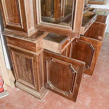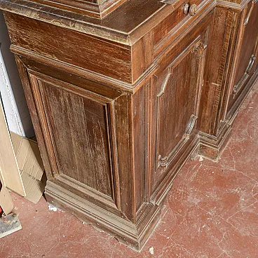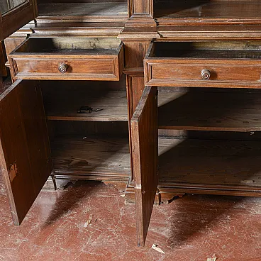 This imposing two-body sideboard represents a superb example of classical-style furniture, ideal for those who wish to lend prestige and authority to a convivial environment. The piece of furniture extends over a generous width, offering a solid and balanced structure that recalls the great tradition of period cabinetmaking. The upper section alternates living rooms with elegant side windows, perfect for displaying collectibles or precious services. The lower body features four doors with shaped panels and four functional drawers, ensuring ample storage capacity. Crafted from fine wood with warm hues, the sideboard features architectural moldings that define its refined design. This vintage piece is the ideal choice for decorating a dining room or library, transforming the space into an environment with timeless and high-class charm.