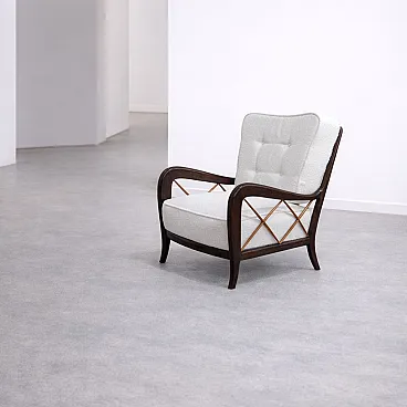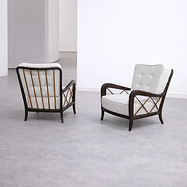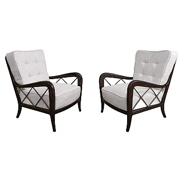 Refined pair of Italian armchairs from the 1940s, made in the style of Paolo Buffa, one of the most representative names of the elegance of post-war Italian design. These seats stand out for their harmonious and light silhouette, defined by curved armrests, balanced proportions and an interesting crossed lateral motif that gives rhythm and personality to the structure.