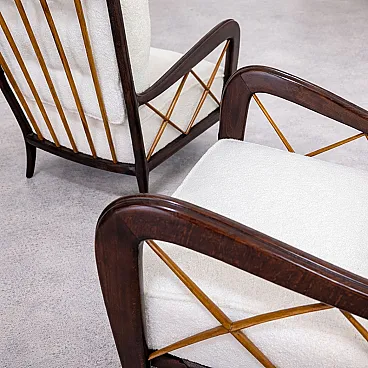 The design combines comfort and formal refinement: the slightly inclined backrest, the wide seat and the shaped profiles make these armchairs welcoming but at the same time extremely decorative. The wooden structure, with a warm and deep tone, interacts with the light covering in a very sophisticated way, creating a contrast typical of the most elegant Italian interiors of the period.