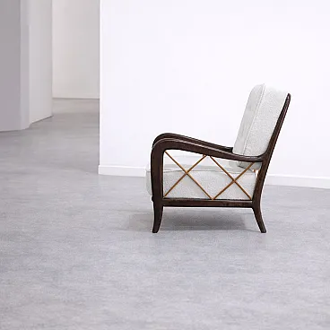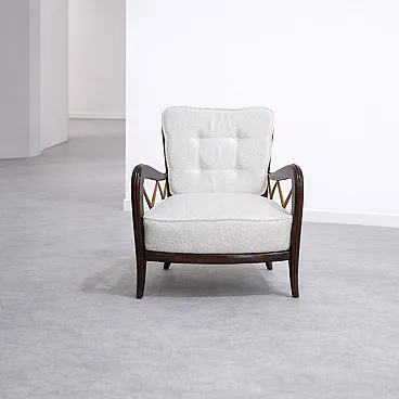 The armchairs have been finely restored, with shellac pad polishing, a traditional process that enhances the surface of the wood and enhances its depth and brilliance. They were also completely reupholstered with a high-quality white bouclé fabric, chosen to restore freshness, materiality and a contemporary presence, while fully respecting the vintage character of the piece.