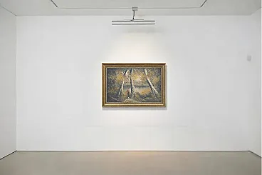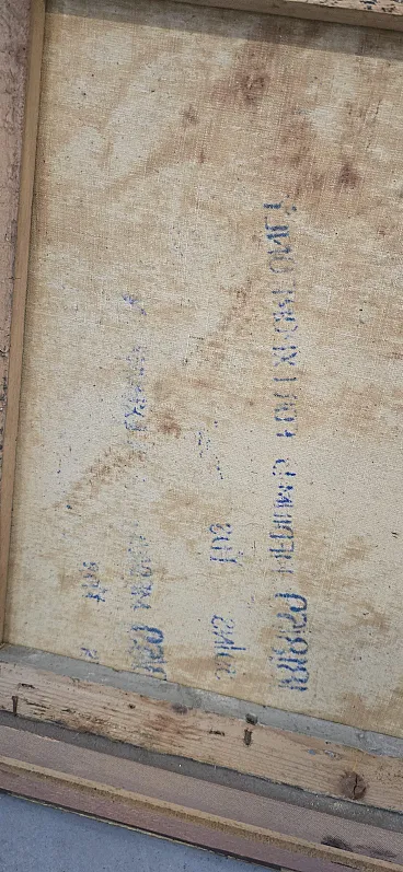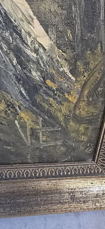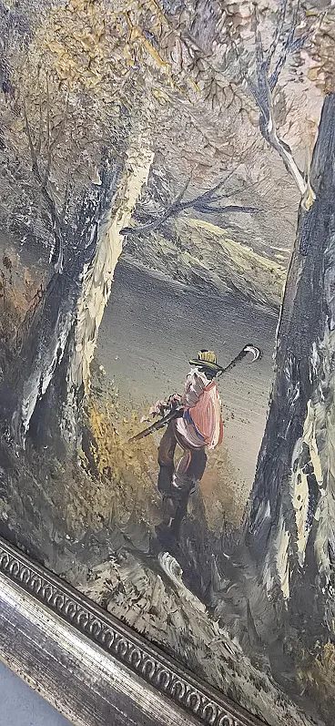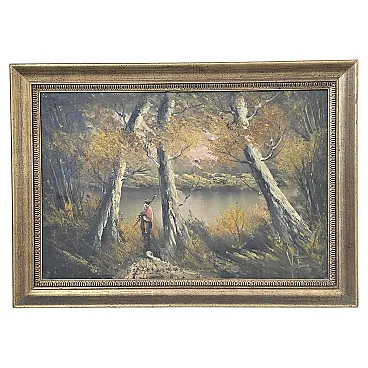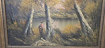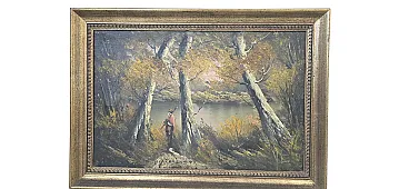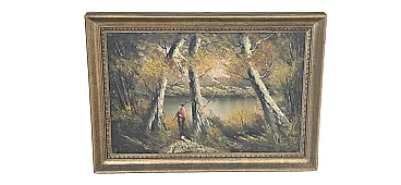 Splendid furniture painting (decor art) from the mid-twentieth century, characterized by a warm color palette and an evocative autumn setting. The work depicts a birch forest on the shore of a lake, enriched by the figure of a traveler who gives depth and narrative to the scene. The painting is made with a material technique with bold brushstrokes, typical of the style of the time, and bears the author's signature (VE) at the bottom right. Main features: Subject: Autumn landscape with birch trees and lake. Era: Vintage (1960s/1980s). Technique: Oil or acrylic on canvas. Frame: Elegant gilded frame with classic relief workmanship, ready to hang. Authenticity detail: The back of the canvas features the original stamps of the period ("For Export Only"), a testament to its history and the decorative art market of the period. Dimensions: Width: 70 cm Height: 50 cm (Total dimensions including frame)
