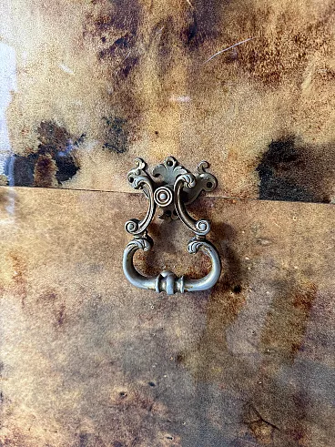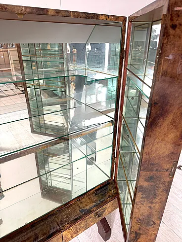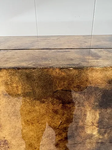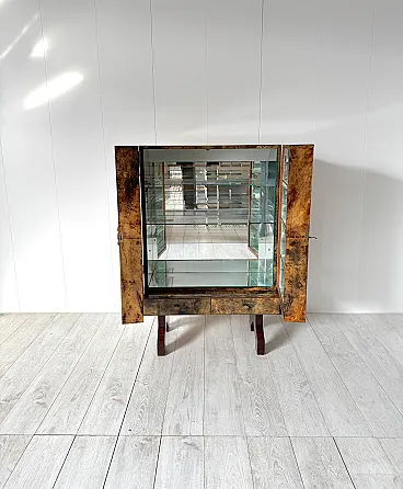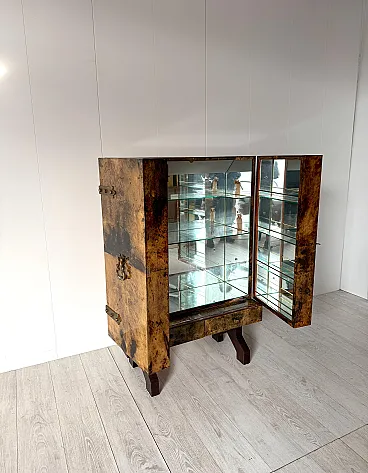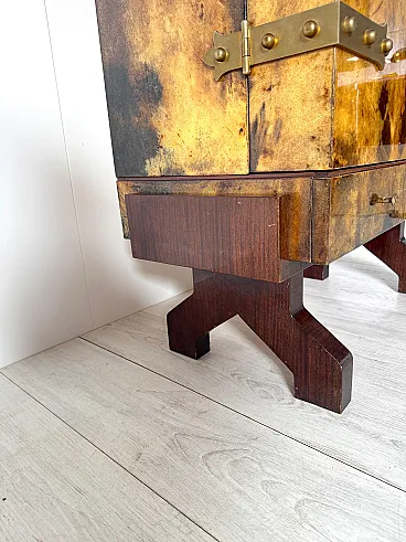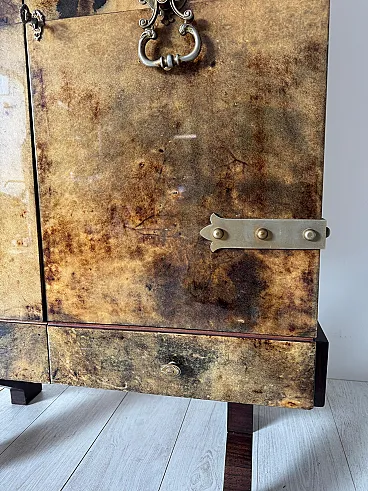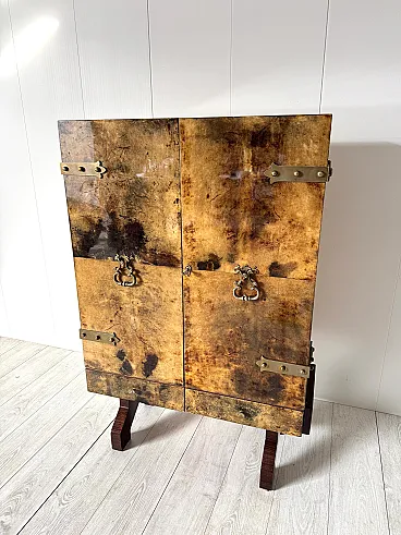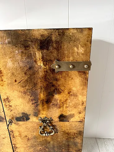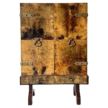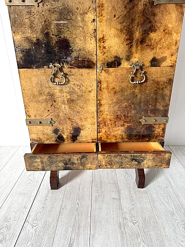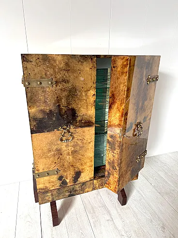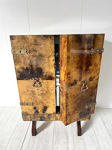 Aldo Tura's mobile bar from the ’50s, in vitrified parchment and brass details, consists of two drawers and two doors illuminated from the inside. Inside this bar is characterized by glass shelves and the presence of mirrors. Vitrified parchment is a fine finish, typical of Italian design from the 1950s to the 1970s (particularly by Aldo Tura), which involves covering furniture or objects with treated animal skin, then sealing them with a transparent, glossy varnish. This technique gives strength, waterproofness and a unique shine to the piece of furniture.