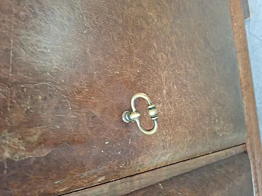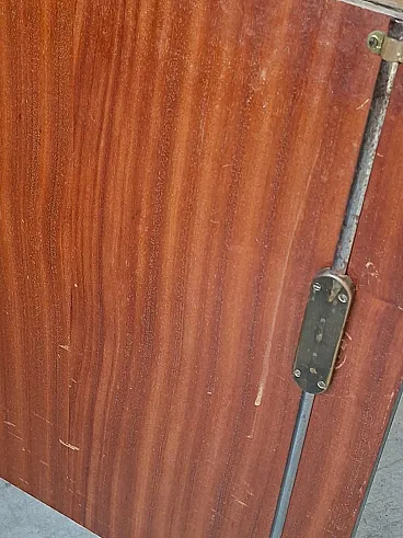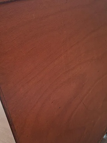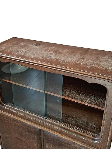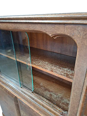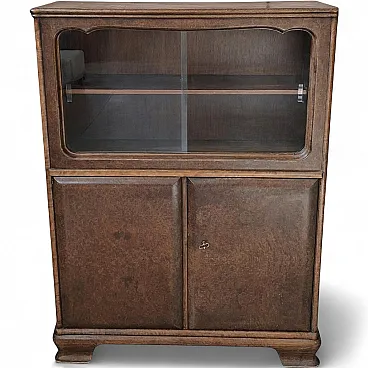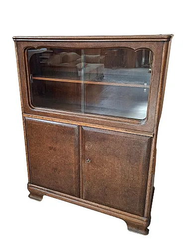 Elegant display cabinet (tall sideboard) dating back to the mid-twentieth century (circa 1945-1955), perfect for lovers of vintage and modern art. The piece of furniture features a design typical of the Italian "Novecento" period, characterized by splendid burl panels that bring warmth and prestige to any space. Main features: Top: Large display case with original sliding glass doors (with handles ground into the glass) and internal shelf for displaying crystals or collections. Bottom: Two large burl casement doors with original lock and working key. Style: A fascinating mix between Art Deco and Mid-Century Modern. CONDITIONS The furniture is structurally sound and healthy. It has the classic signs of age on the surface finish (paint whitening spots and contact halos on the top), as seen in the photo. Ideal for a conservative restoration project that brings its original splendor back to light. DIMENSIONS AND WEIGHT Height: 135 cm Width: 102 cm Depth: 39 cm Estimated weight: approximately 100 kg (very sturdy and stable mobile)