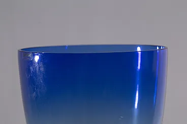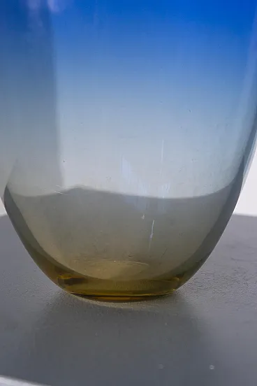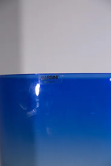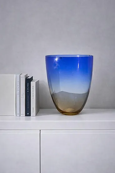 Alfredo Barbini for Murano Sommerso Glass Vase with Original Label 1990s A refined Murano glass vase by Alfredo Barbini, dating to the 1990s and retaining its original label, an elegant example of late twentieth-century Italian glass design in its most essential and sophisticated form. The vase is distinguished by its pure, softly tapered silhouette, whose generous proportions and balanced oval body convey a sense of quiet monumentality. Free from applied ornament, the piece relies entirely on the beauty of form, color, and light to assert its presence, revealing Barbini’s mastery in transforming simplicity into sculptural elegance. Particularly striking is the vase’s graduated chromatic effect, in which a deep, luminous cobalt blue at the rim gently dissolves into a paler translucent tone before settling into a warm amber base. This subtle transition creates an extraordinary sense of depth and atmosphere, allowing the glass to capture and refract light with remarkable softness. The restraint of the design is precisely what gives the piece its strength. The absence of decorative excess emphasizes the exceptional quality of the glass and the sophistication of its coloration, resulting in an object that feels at once minimal, poetic, and deeply architectural. It is a vase that speaks through proportion, transparency, and tone rather than gesture, making it especially timeless. Elegant and versatile, this work is ideally suited to a living room, console, sideboard, or a carefully curated collection of Murano artistic glass, where its luminous surface and sculptural presence can be fully appreciated. A vase of great decorative refinement, embodying the quiet luxury and technical excellence of Italian glassmaking.