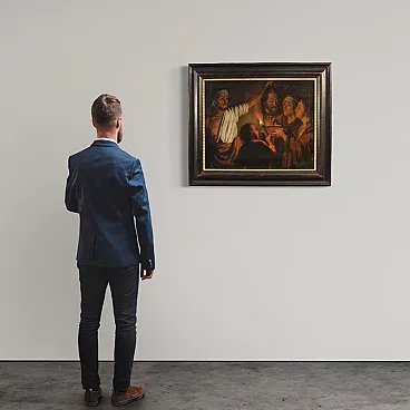 The mother of Salome had abandoned her husband to live with her brother-in-law, King Herod. John the Baptist publicly condemned what happened and was imprisoned for it. To please the beautiful Salome, Herod then had the Saint beheaded. The work depicts the culminating moment of the Gospel episode in which the princess receives the head of the Baptist on a plate: the executioner lifts him by the hair, while a young figure in the foreground holds the light which dramatically hits the faces of those present.