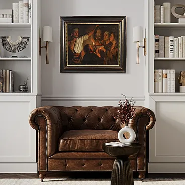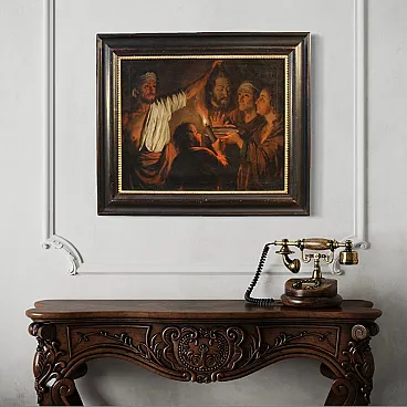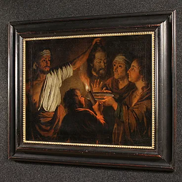 Refined Flemish painting from the first half of the 19th century. Oil work on canvas depicting Salome with the head of Saint John the Baptist. Derived from a famous invention by Matthias Stomer (1600-1650), master of Nordic Caravaggism, the composition reproduces with remarkable fidelity the original now exhibited at the National Gallery in London, from which it inherits the scenic strength and the powerful contrast between light and shadow.