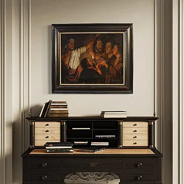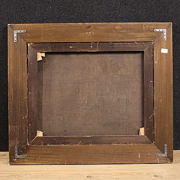 Painting with great decorative effect, ideal for classic environments, professional studios or historic homes. Modern antiqued frame in lacquered and gilded wood. Work already restored with relining, replacement of the frame and color recovery in small spots. Overall in good state of conservation. Light painting H 51.5 x W 64 cm.