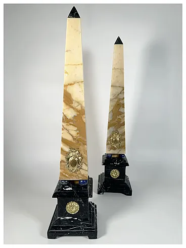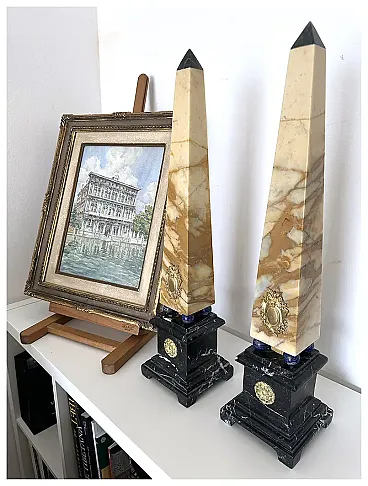 The pyramidal shaft is made of Giallo Siena marble, a precious Italian marble characterised by a typical cream-ivory background crossed by lively ochre, amber and red-brown veins.