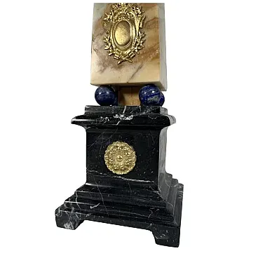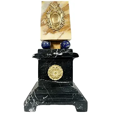 Made of yellow Siena marble, black Belgian marble, black marble apex tip (probably Marquina), lapis lazuli spheres, gilded bronze applications.