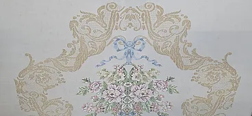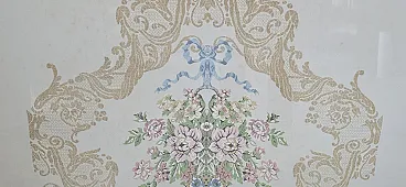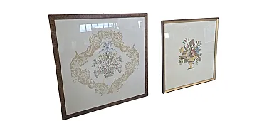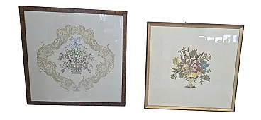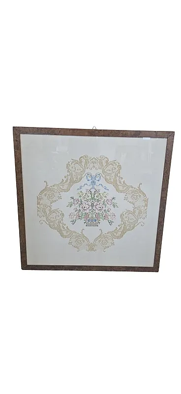 splendid pair of period paintings made entirely by hand with a very refined embroidery technique (small stitch/half stitch). These pieces represent the excellence of the home crafts of the past, ideal for enriching elegant living rooms, entrances or bedrooms with a retro, vintage or Shabby Chic taste. ✨ Main Features: Subjects: Refined floral arrangements and still lifes in vases, with baroque ornamental motifs and still vibrant pastel colors. Frames: Fine frames included. One in fine walnut burl and the other with a classic golden profile. Both complete with protective glass. Status: Excellent conservative condition, ready to hang. 📏 Detail dimensions: Rectangular painting (Pattern with friezes and bow): Height: 80 cm Width: 77 cm Thickness: 1.5 cm Square painting (Central flower vase): Height: 84.5 cm Width: 84.5 cm Thickness: 1.5 cm