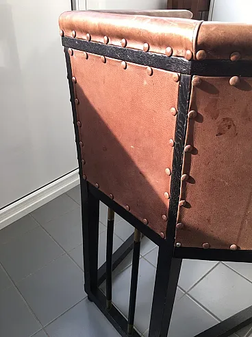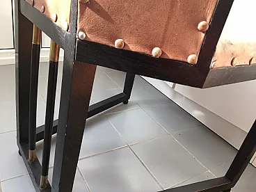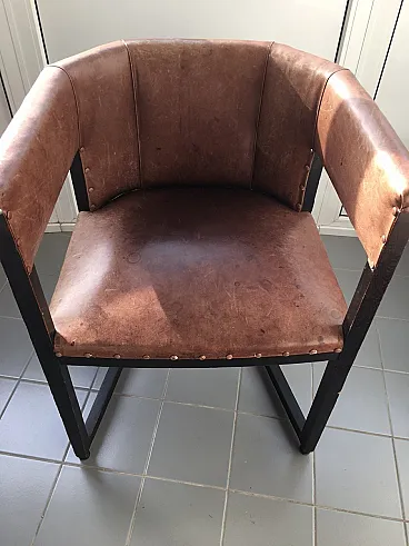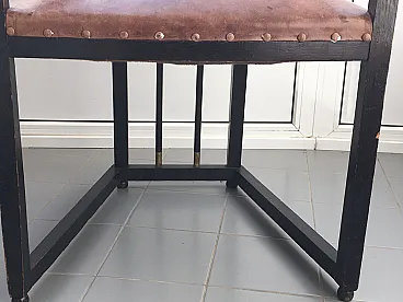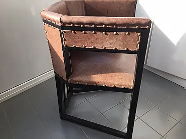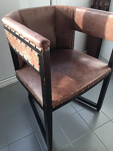 An elegant and architecturally composed armchair attributed to Josef Hoffmann, one of the leading figures of the Vienna Secession and co-founder of the Wiener Werkstätte. The design embodies Hoffmann's signature aesthetic: rigorous geometry, visual clarity and a refined balance between structure and material. The chair features a dark stained wood frame with a clean, linear structure, creating a bold, almost graphic silhouette. The warmth of the brown leather upholstery softens the composition, while the decorative metal studs accentuate the contours of the seat and backrest, adding a subtle artisanal character. The vertical elements in the lower structure introduce rhythm and lightness to the overall shape. This piece is a striking example of early 20th century Viennese design, where functionalism meets understated luxury. It works beautifully as a statement piece in both classic and contemporary interiors. Materials Wood (dark stained / ebonized look) Leather (replaced at a later time) Metal studs / accessories Attribution Attributed to Josef Hoffmann In the manner of Wiener Werkstätte. Provenance: formerly in a private European collection; purchased on the antiques market in Vienna (Austria). The object has been in Europe for several decades.