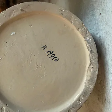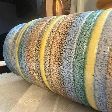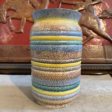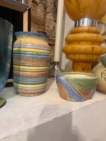 This exceptional 1930s Art Deco ceramic vase is a striking example of the Futurist movement, crafted by the renowned Ceramiche di Albisola. A true collector's piece, the vase features a bold, rhythmic design of horizontal bands in a vibrant palette of sunny yellow, seafoam green, and deep cerulean blue. These colorful rings alternate with textured, speckled earth tones, creating a dynamic visual energy and a rich tactile quality characteristic of the period's experimental spirit. The vessel transitions from a sturdy, rounded base to a gracefully flared rim. The interior reveals the natural, pale ceramic body, contrasting beautifully with the high-gloss and textured glazes of the exterior. This vase embodies the transition from traditional Italian pottery to the avant-garde aesthetic of the 1930s, making it a sophisticated addition to any collection of Art Deco or Futurist art. Its hand-crafted nature is evident in the slight variations of the glaze and the charming imperfections that provide genuine vintage character. it's in excellent vintage condition.