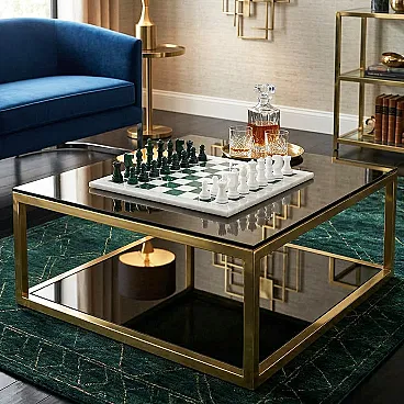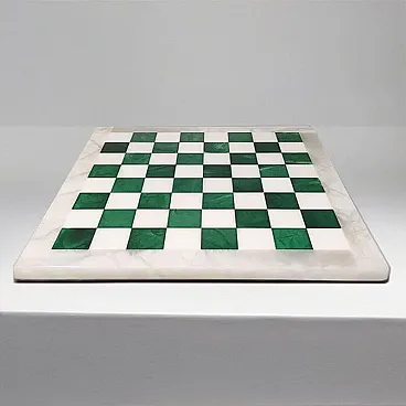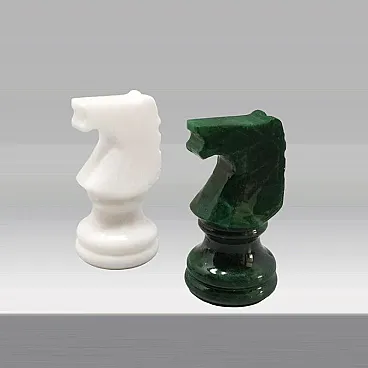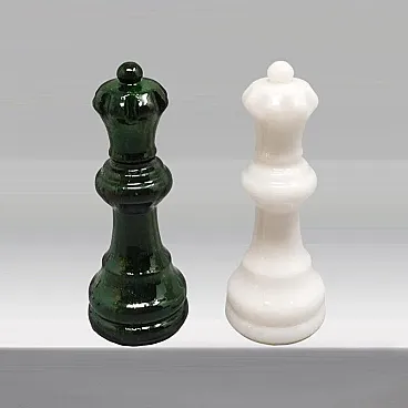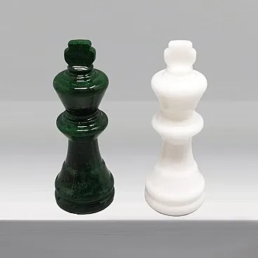 1970s An exceptional mid-century statement piece, this vintagechess set is handcrafted from genuine Volterra Alabaster, a natural stone renowned since the Etruscan era for its translucency and unique veining. While many Italian sets of this era utilize traditional brown or black tones, this specific set features a rare and highly sought-after forest green and crisp white color palette, making it a striking decorative object for a modern or eclectic interior. Each piece is individually hand-turned by skilled Italian artisans, showcasing the organic patterns of the mineral. The board is beautifully weighted and features a polished finish that highlights the natural "clouds" within the stone. This set has been meticulously preserved; all 32 pieces are present, intact, and free of chips or cracks. The board remains flawless with a smooth, reflective surface. It's in excellent condition.So rare to find it in green and white color.