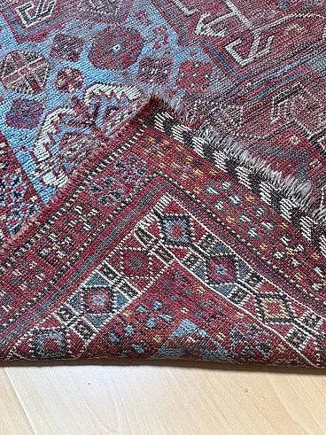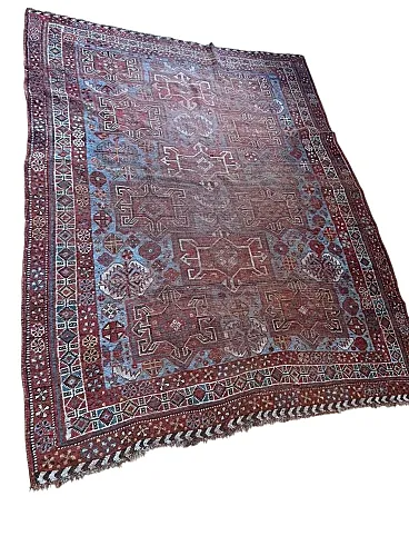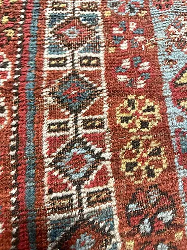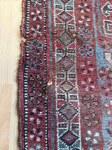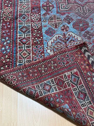 This is a beautiful antique Baluch (Baluchi) tribal rug, hand-knotted in wool, originating from the Baluchistan region (likely Northeast Persia or adjacent areas) and dating to the late 19th century (circa 1880–1900). The rug displays a classic all-over tribal composition with repeating geometric medallions, including large octagonal or diamond-shaped guls (tribal motifs often associated with specific clans), framed by intricate latch-hook elements, stylized trees or shrub-like forms, and smaller geometric fillers in rich earthy tones. The dominant palette features deep madder red and burgundy fields, accented with midnight blue, soft camel/ivory, teal-blue details, golden yellows, and touches of green. The main border is wide and elaborate, with repeating geometric patterns, meandering vines, and protective serrated or zigzag motifs in contrasting dark outlines that give the design its bold, graphic character typical of nomadic Baluch weaving.