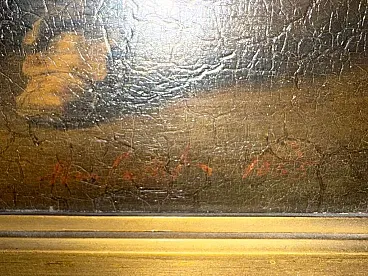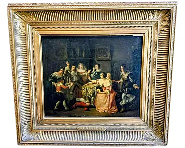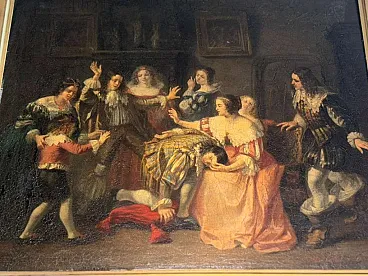 Lively theatrical genre scene attributed to Adolphe François Monfallet (Bordeaux 1816 – Neuilly-Plaisance 1900), a 19th century French painter known for his historical and genre scenes inspired by 17th and 18th century life. The composition depicts a lively group of characters dressed in Baroque/Rococo period costumes, gathered in an elegant interior with fireplace, shelves and period furnishings. In the center, a male figure lies on the floor, surrounded by women and men engaged in expressive gestures, suggesting a humorous or dramatic narrative. The scene is rendered with a strong sense of theatrical staging, dynamic movement, and carefully observed costume detail. Such subjects are characteristic of the work of Monfallet, who specializes in genre scenes set in historical interiors, often with playful or anecdotal overtones. His background as a classical dancer and later régisseur at the Paris Opéra is reflected in the dramatic mise-en-scène, expressive poses and costume-driven narrative. The painting is signed and dated 1853, in keeping with the artist's early salonnier period, during which he exhibited regularly in Paris from 1850.