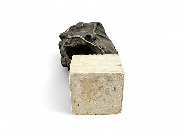 This dark patina bronze sculpture portrays the bust of a smiling young man, characterized by a blindfold that entirely covers his eyes, recalling the classic iconography of the "blind man's buff" or an allegory of innocence and play. The work stands out for its dynamic and vibrant modeling, particularly evident in the wavy hair and in the details of the ribbon knotted around the neck, which suggest a stylistic influence attributable to the Italian sculptor Medardo Rosso or to the Verismo movement of the late nineteenth century. The head rests on a quadrangular base in light veined marble, fixed by an exposed metal pin which underlines its artisanal structure. The bronze surface has an irregular texture that captures the light in a fragmented way, emphasizing the joyful and vital expression of the face.
