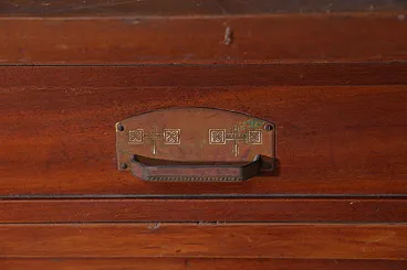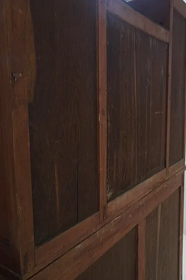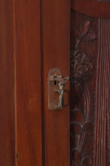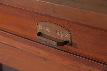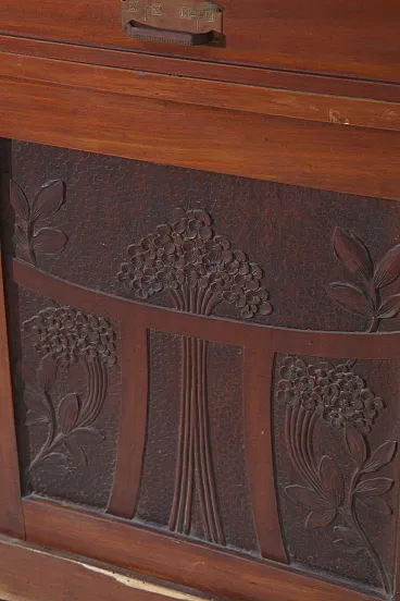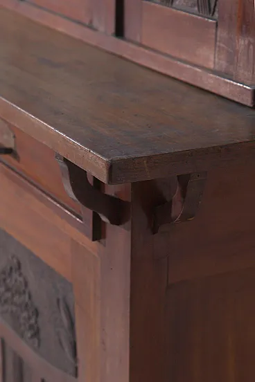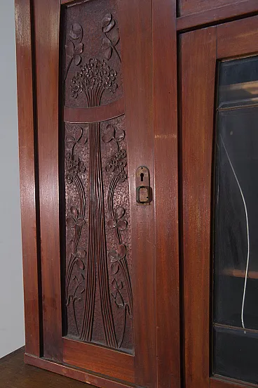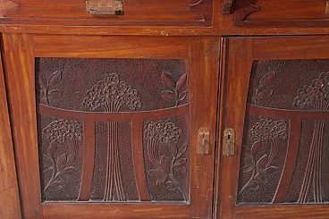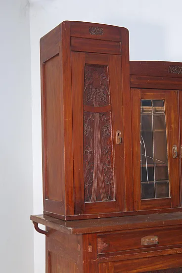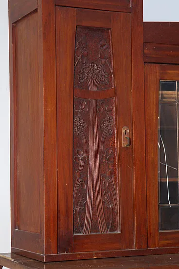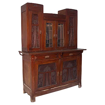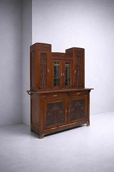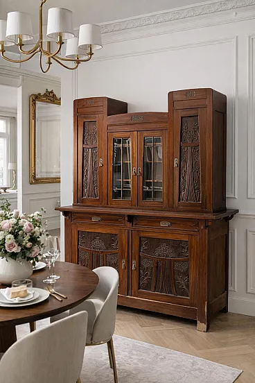 Italian Art Nouveau Carved Walnut Buffet Cabinet with Floral Relief Panels, Early 20th Century Liberty Style This refined Italian Art Nouveau buffet cabinet, dating to the early 20th century, embodies the lyrical elegance and craftsmanship of the Liberty style. Executed in richly patinated walnut, the piece presents a harmonious architectural composition, where structure and ornament coexist in a fluid and organic dialogue. The lower section features two cabinet doors adorned with finely carved floral motifs—stylized botanical forms that rise vertically in a rhythmic, almost architectural cadence. These decorative elements are emblematic of the Italian Liberty movement, where nature is abstracted into linear, expressive ornamentation. Above, a central glazed vitrine introduces a sense of lightness and transparency, framed by delicately structured muntins that subtly echo geometric tendencies emerging at the turn of the century. Flanking this central section are two vertical cabinets, each enriched with carved wooden panels that reprise the floral vocabulary of the lower doors, creating a cohesive decorative program across the entire façade. Two drawers, positioned beneath the upper structure, are fitted with original brass handles featuring geometric relief detailing—an elegant contrast to the fluidity of the carved ornament. The overall composition reflects a balance between craftsmanship and functionality, making the piece both sculptural and highly practical. Preserved within the distinguished domestic setting of Casa Moneta in Milan, this cabinet forms part of the personal collection of Gianantonio Malacrida, offering insight into his cultivated aesthetic sensibility and appreciation for early modern decorative arts. An ideal statement piece for formal dining interiors or historically informed spaces, this buffet exemplifies the enduring sophistication of Italian Art Nouveau design.