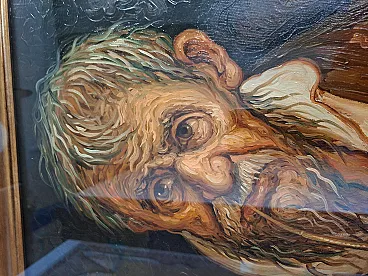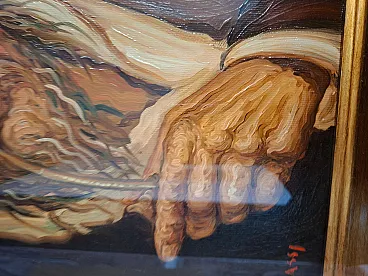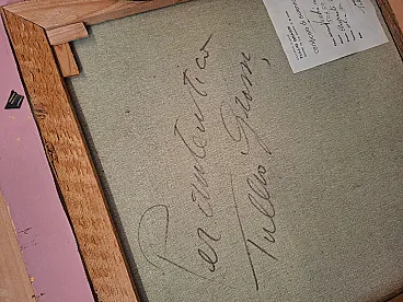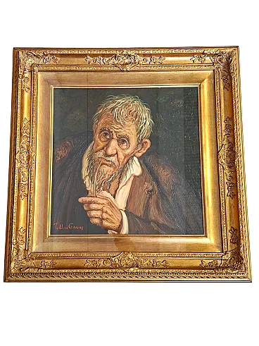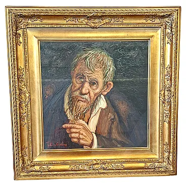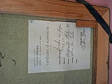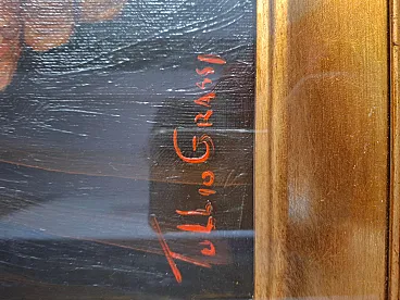 Splendid authentic work by the Salerno master Tullio Grassi (1921-1999), entitled "Old Man with a Pipe". The painting is a masterful example of the author's expressionist style, capable of imparting incredible psychological strength and emotional intensity to the canvas. The work is characterized by a material and vigorous brushstroke that makes the subject's face alive and deep. Details and Authenticity: Author: Tullio Grassi (Autograph signature in red at bottom left). Title: Old Man with Pipe. Technique: Oil on canvas. Certification: Present on the back Original Certificate of Authenticity from the "Galleria d'Arte Tullio Grassi" (Salerno). Countersignature: The work has the autograph inscription "For authentic - Tullio Grassi" on the back of the canvas. Frame: Elegant and imposing period gilded frame, embossed, which enhances its importance. Dimensions (with frame): Height: 80 cm Width: 80 cm Depth: 8 cm Weight: approximately 3 kg (Note: The inner canvas measures 50x50 cm as per certificate). State of conservation: The work is in excellent condition, perfectly preserved in both colors and support. Ready to hang.