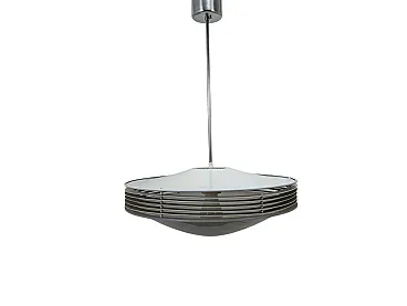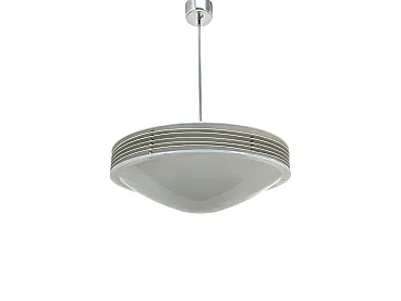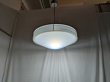 This splendid Stilnovo pendant lamp, an authentic icon of Italian design from the 1950s, perfectly embodies the spatial and rationalist aesthetic of the period. The piece stands out for its large lenticular diffuser in etched glass, topped by a circular metal slat structure that shields the light with elegance, creating a soft and suggestive diffusion. The contrast between the purity of the white and the geometric rigor of the metal profiles makes it a timeless furnishing object, ideal for illuminating living environments or professional studios with character.
