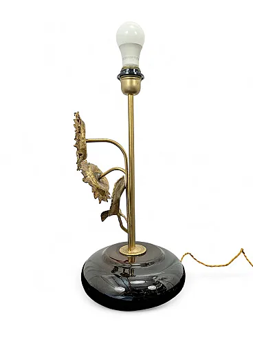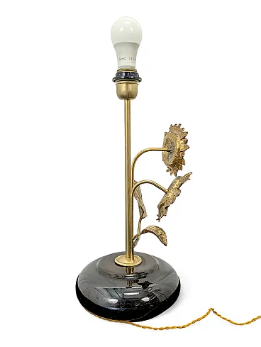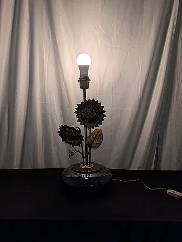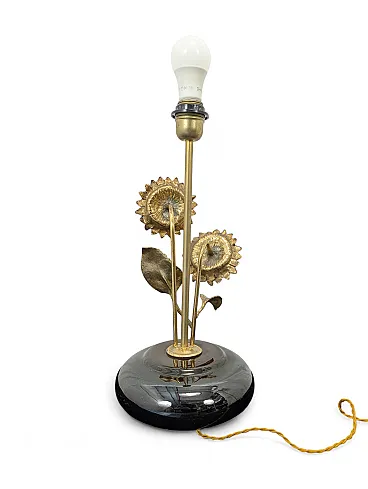 This refined table lamp captures the essence of vintage style with a finely crafted golden brass structure in the shape of sunflowers. Two large detailed corollas and textured leaves branch elegantly from a central stem, resting on a rounded black porcelain base with a mirror finish that gives extreme shine and modernity to the whole. The contrast between the warm materiality of the metal and the smooth surface of the ceramic makes this piece a sculptural furnishing accessory, capable of combining a retro charm with a decidedly sophisticated aesthetic.
