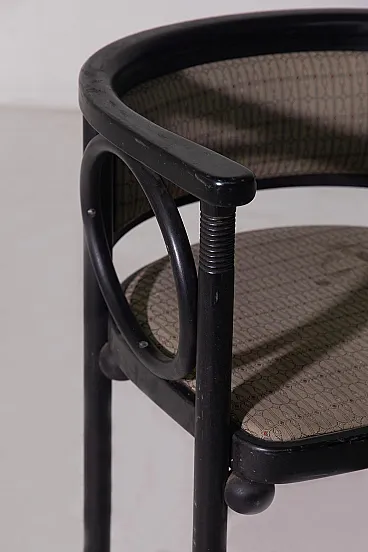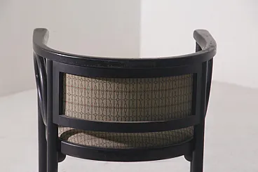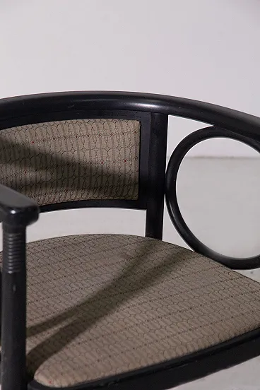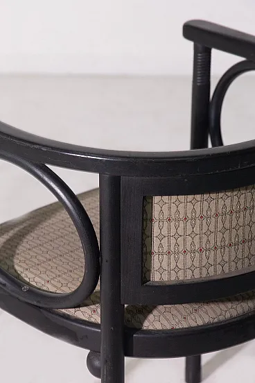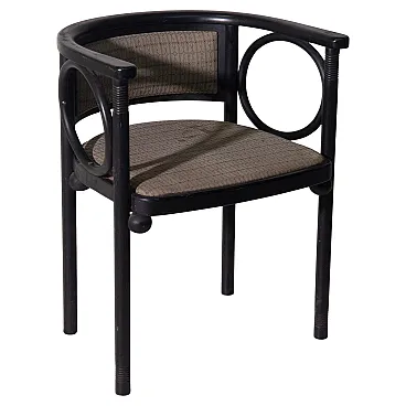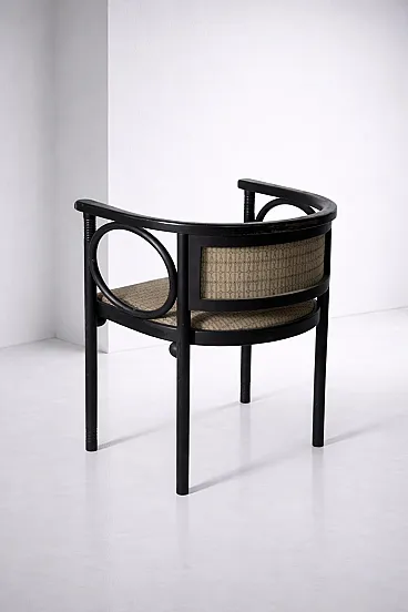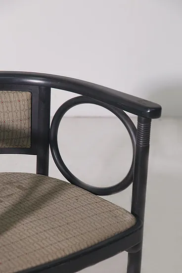 Art Deco Armchair by Josef Hoffmann for Wittmann – Wiener Werkstätte An exceptional Art Deco armchair by the renowned Viennese master Josef Hoffmann, produced by Wittmann within the refined context of the Wiener Werkstätte. This piece perfectly embodies the balance between aesthetics and functionality, expressing the highest level of early 20th-century craftsmanship. 1920 circa. The ebonized wood structure stands out for its harmonious yet rigorous design language, characterized by a refined interplay of geometric lines and soft, rounded forms. Distinctive circular elements integrated into the armrests lighten the composition visually, giving the chair a timeless elegance—details that clearly demonstrate outstanding cabinetmaking mastery. The upholstery is original and preserved in excellent condition, a highly desirable feature for discerning collectors. The generously proportioned seat is further enhanced by spherical elements beneath, adding rhythm and sophistication while emphasizing the remarkable level of craftsmanship. The slightly curved backrest is designed to provide optimal comfort, naturally embracing the sitter. The legs, crafted from a single turned लक wood element, are enriched with delicate circular carvings—another testament to the extraordinary skill of the cabinetmaker and the meticulous attention to detail. Ideal for refined interiors, whether in a classic living room or an elegant study corner, this armchair represents a perfect synthesis of art, design, and history.