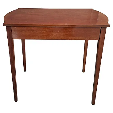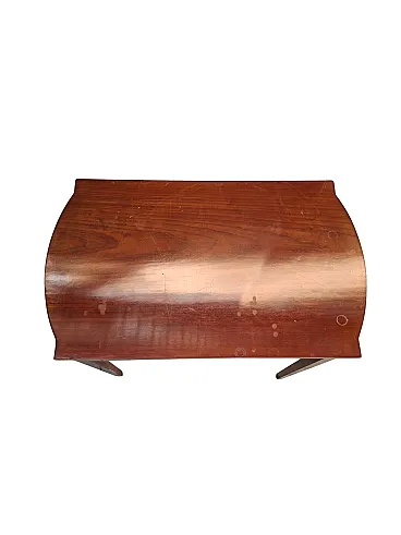 Gorgeous Mid-Century Modern coffee table, dating back to the 1960s. The piece of furniture stands out for its elegant and dynamic lines: the top features a refined "boat" profile with curved edges, supported by four tapered legs typical of the rationalist design of the time. Equipped with a practical and spacious pop-up drawer, it is a versatile piece of furniture, ideal as a bedside table, entryway furniture or sofa table. Details and Conditions: The furniture is structurally solid and lightweight. As an original vintage piece, it has the normal signs of age that testify to its history: Surface: There are circular halos (water/humidity spots) and some surface scratches on the plane (as visible in the detail photos). Status: The wood retains a beautiful warm grain; defects are purely aesthetic and can be resolved with a minor conservative restoration or covered with a doily/furniture complement. Measurements: Height: 56 cm Width: 64 cm Depth: 38 cm Weight: approx. 3 kg (very easy to handle)