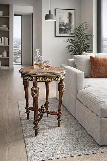 Refined vintage Louis XVI style circular coffee table. This piece of furniture combines the austere elegance of mahogany with the vivacity of red marble and the splendor of bronze applications. The proportions (76x50 cm) make it a versatile piece of furniture, perfect as a lamp holder or conversation table. The structure is solid and heavy (15kg), an indication of high-quality artisanal manufacturing. The carefully crafted details, from the grooves of the legs to the bronze festoons, recall the taste of great French cabinetmaking. A classy piece for those looking for an authentic and visually striking period element Material: Fine mahogany wood, red marble top (Red France variety) and gilded bronze applications. Style: Louis XVI (Neoclassical) with fluted stiletto legs and garland friezes. State of preservation: Excellent vintage state, solid structure, intact marble and well-preserved bronzes. Measurements: Height: 76 cm Flat diameter: 50 cm Weight: approximately 15 kg (extremely stable thanks to the marble base and the reinforcing crosspiece).