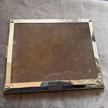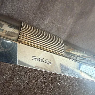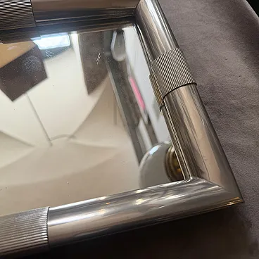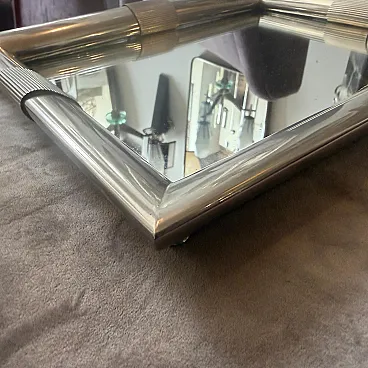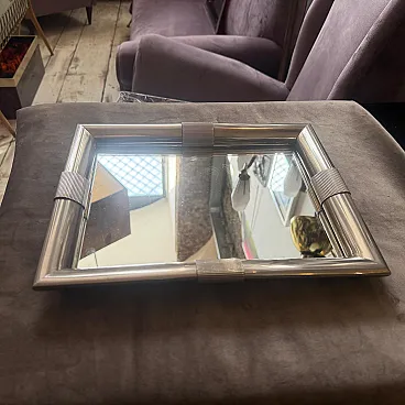This 1970s Mid-Century Modern tray is an exquisite example of Italian glamour designed by the renowned Tommaso Barbi. Crafted during a period when Barbi was defining the high-end aesthetic of Hollywood Regency, this piece features a sleek, silver-plated frame characterized by its bold tubular structure and elegant ribbed decorative bands. The mirrored glass surface creates a sophisticated play of light, while the reverse side reveals the authentic "Made in Italy" stamp alongside Barbi’s signature cursive engraving, confirming its origin and designer pedigree. The combination of industrial-inspired geometry and luxurious materials makes it a highly collectible accessory that bridges the gap between functional homeware and fine sculpture. Whether used as a vanity tray or a centerpiece, its timeless design retains a modern edge that remains deeply relevant in contemporary interiors. It's in excellent vintage condition.