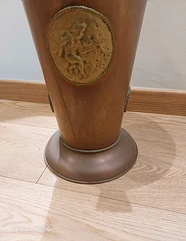 Materials: The main body is made of hammered or smooth copper sheet, while the handles and decorative friezes are made of brass or bronze to create a color contrast.